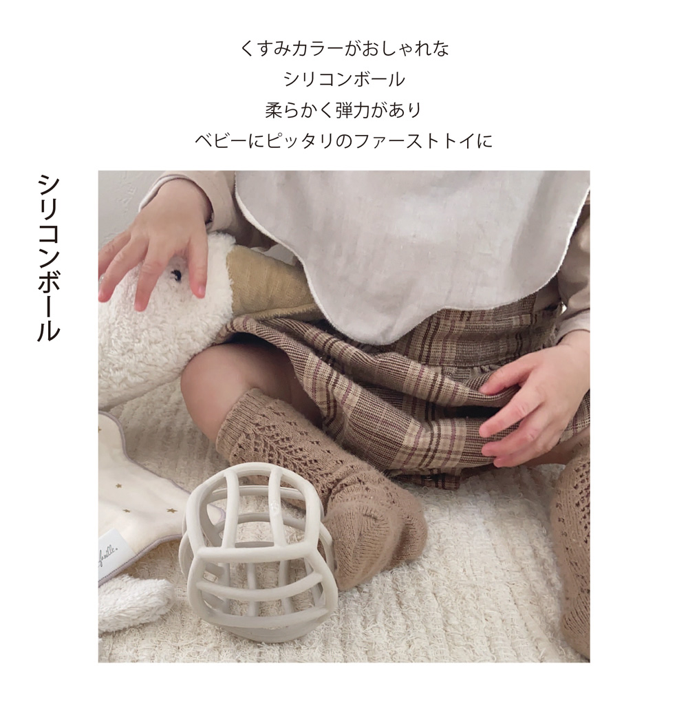 シリコン素材のベビーボール優しいくすみカラーと、ボール型のデザインで、ベビーば持っているだけでかわいい。