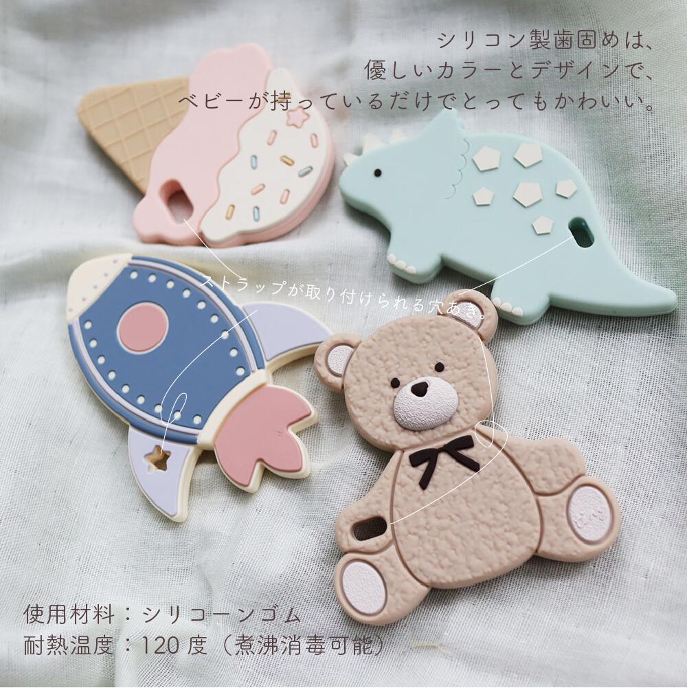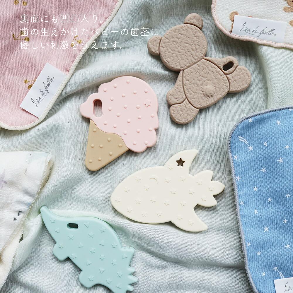 モチーフシリコン歯固めは優しいカラーとキュートなデザインで、ベビーば持っているだけでかわいい。写真映えもバッチリな歯固めです。