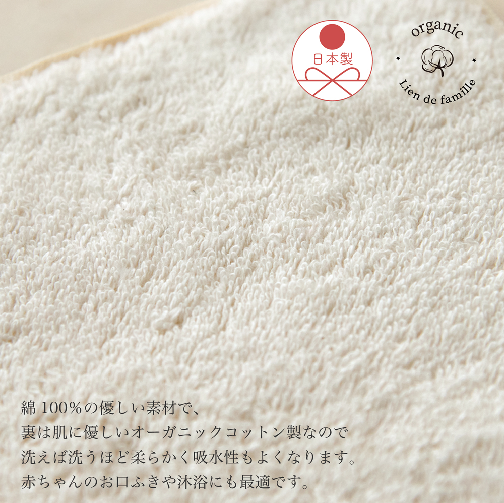 ミニハンカチの表地はプリント入りのは綿100%で裏はオーガニックコットンのパイル素材です。