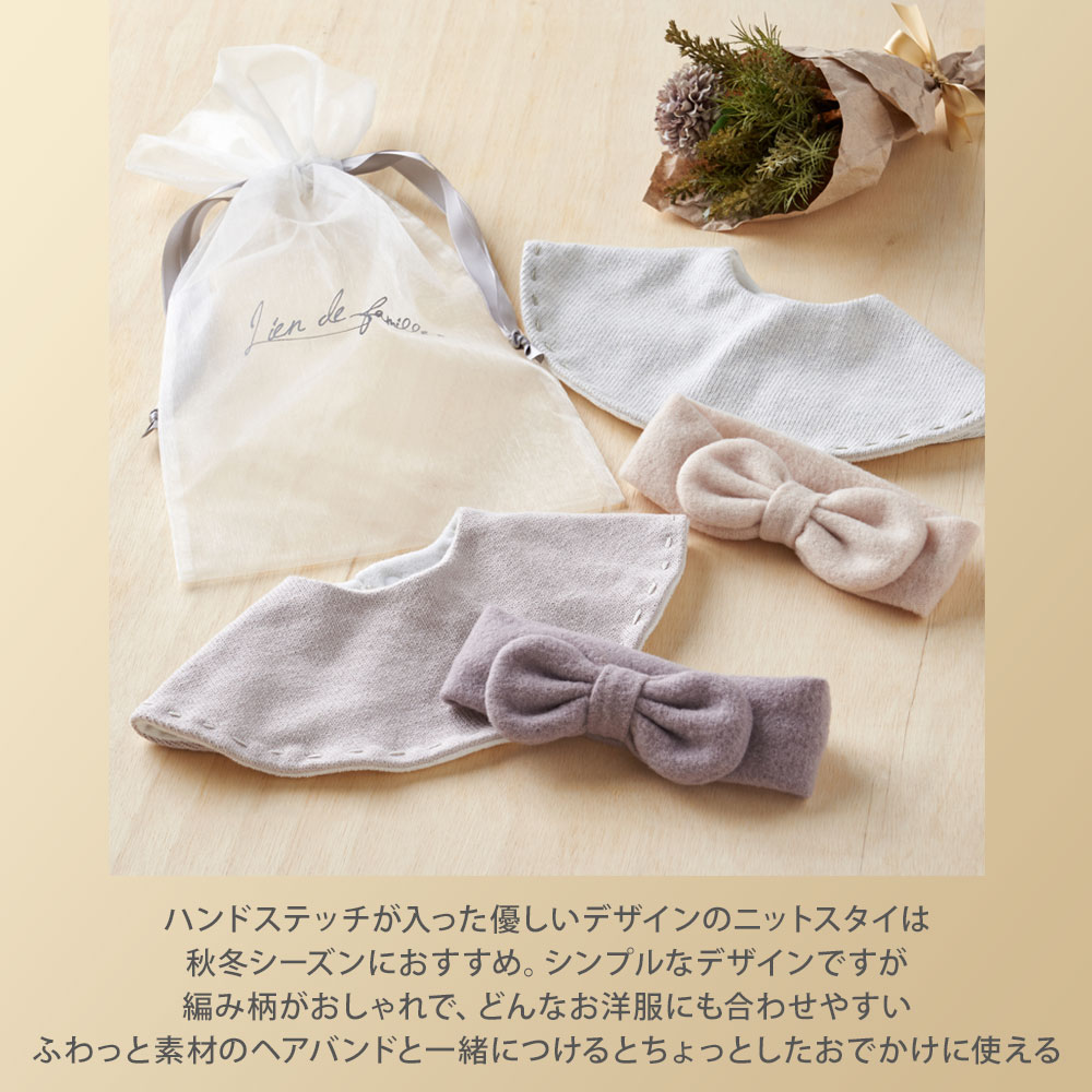 - ハンドステッチが入った優しいデザインのニットスタイとふわふわ素材のヘアバンドのギフトセットは冬シーズンに向けておすすめです。