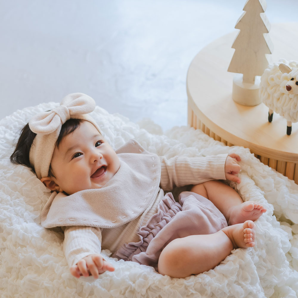 ヘアバンドはまるっとしたリボンが愛らしく、赤ちゃんの可愛さを更に引き立てます。