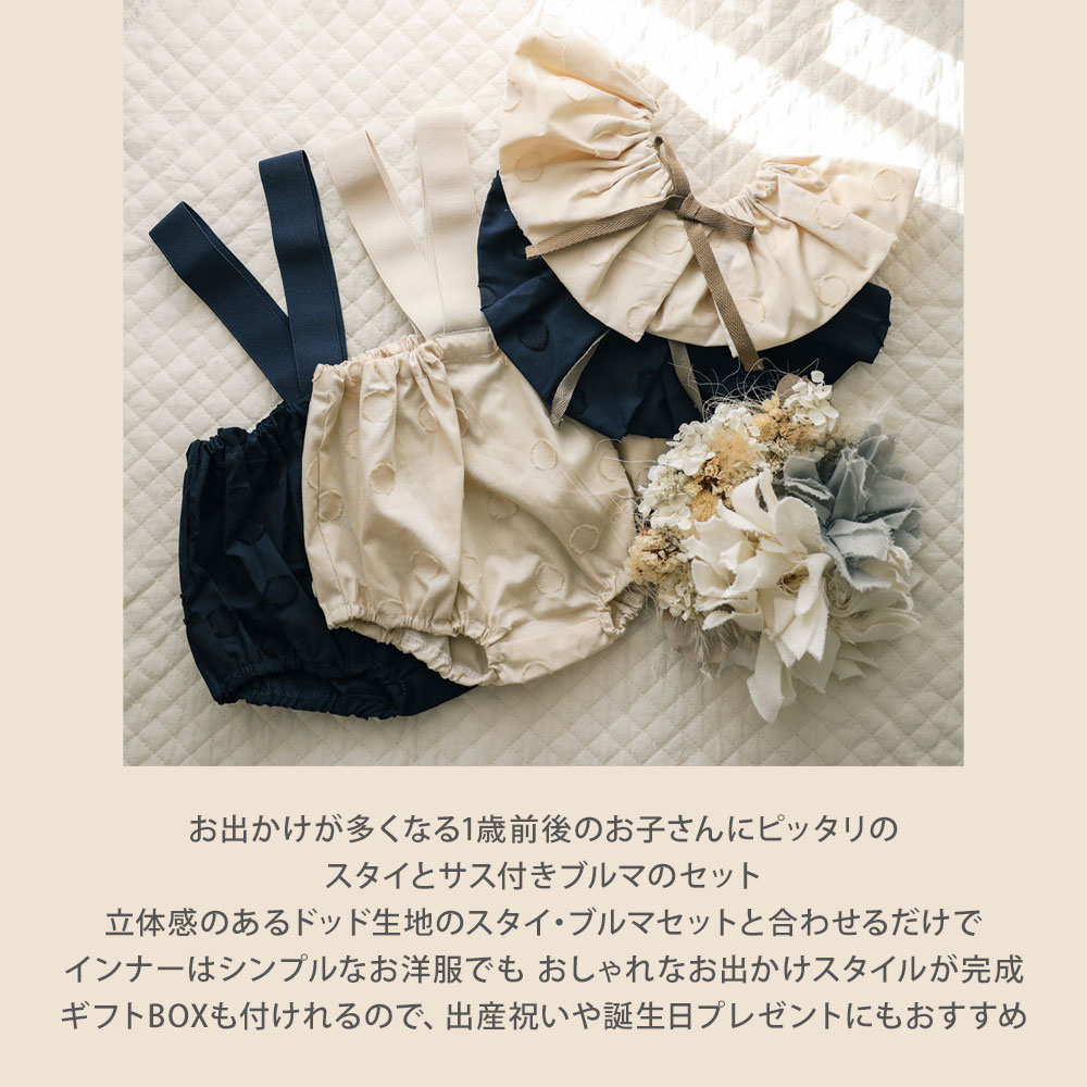 - 1歳前後の赤ちゃんに向けたデザインスタイとサスペンダー付きブルマのセットが登場!