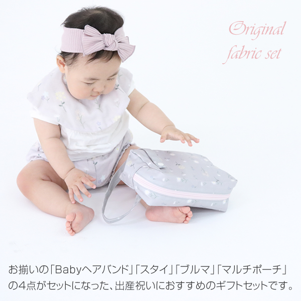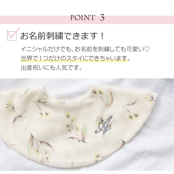 スタイ、ポーチは名入れ刺繍可能なので、出産祝いなど特別な贈り物におすすめです。