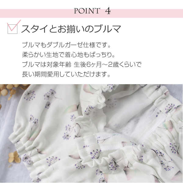 スタイやブルマは使いやすいガーゼ素材なので、ご自宅用で日常使いするのにもおすすめです。