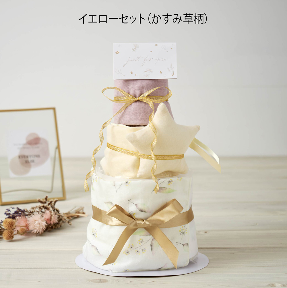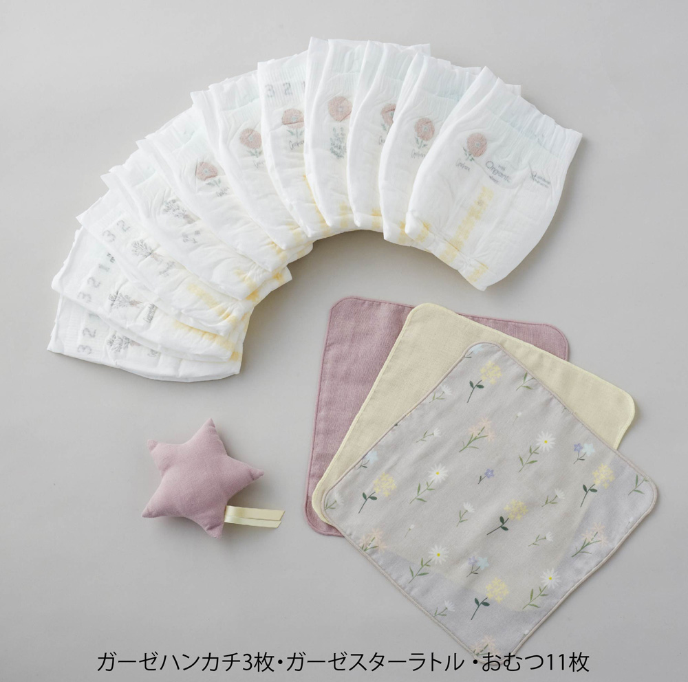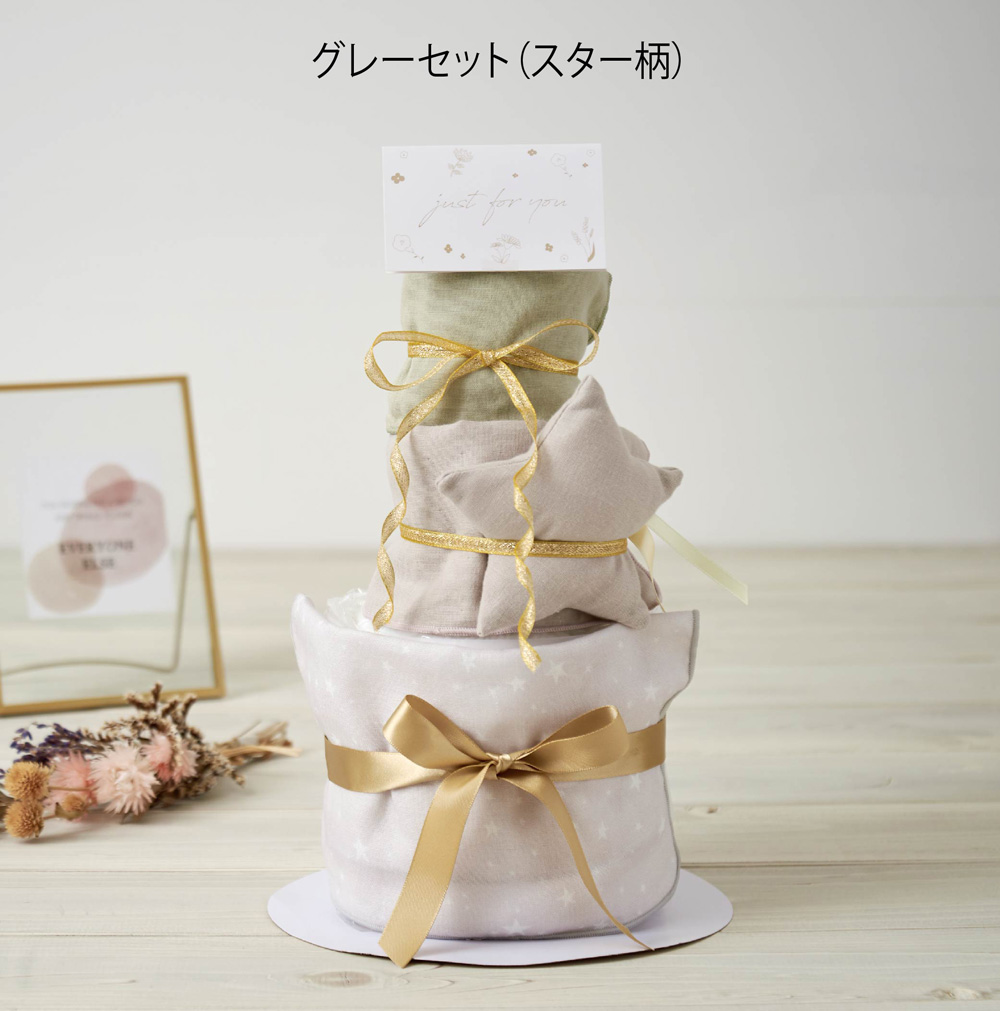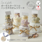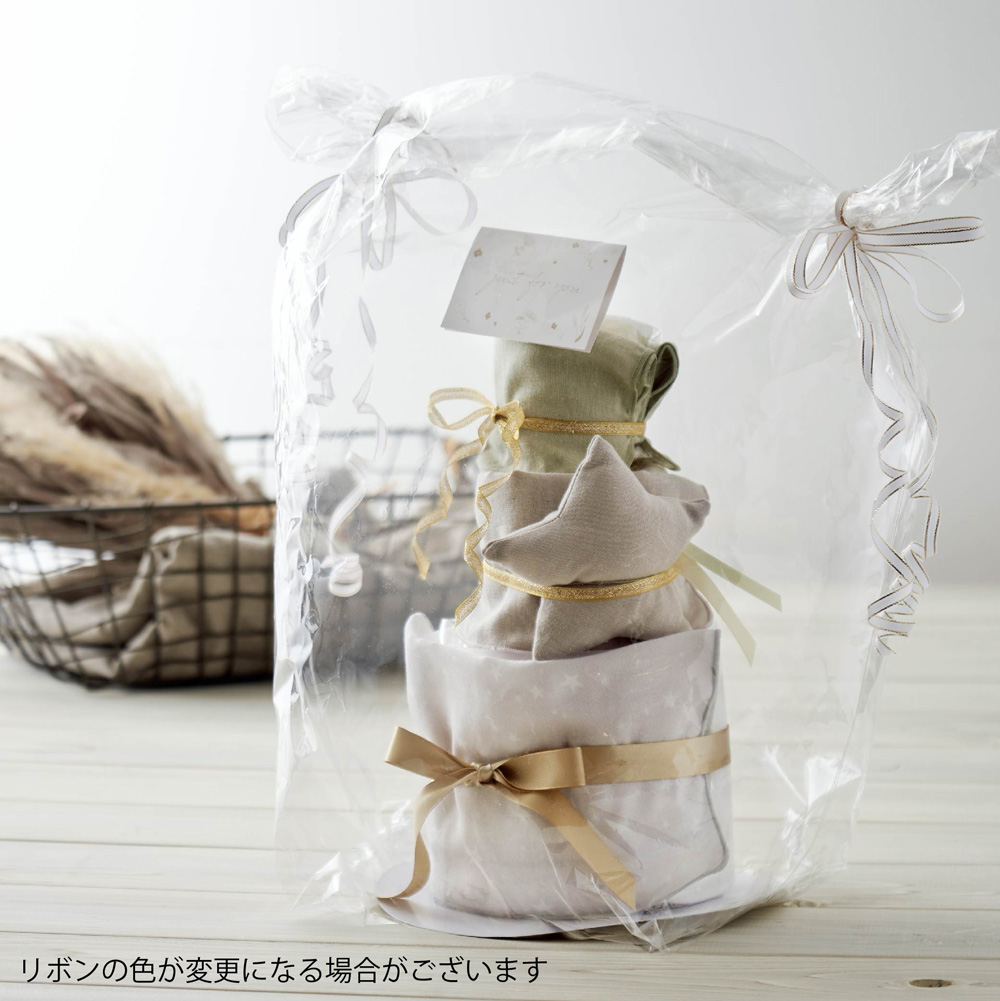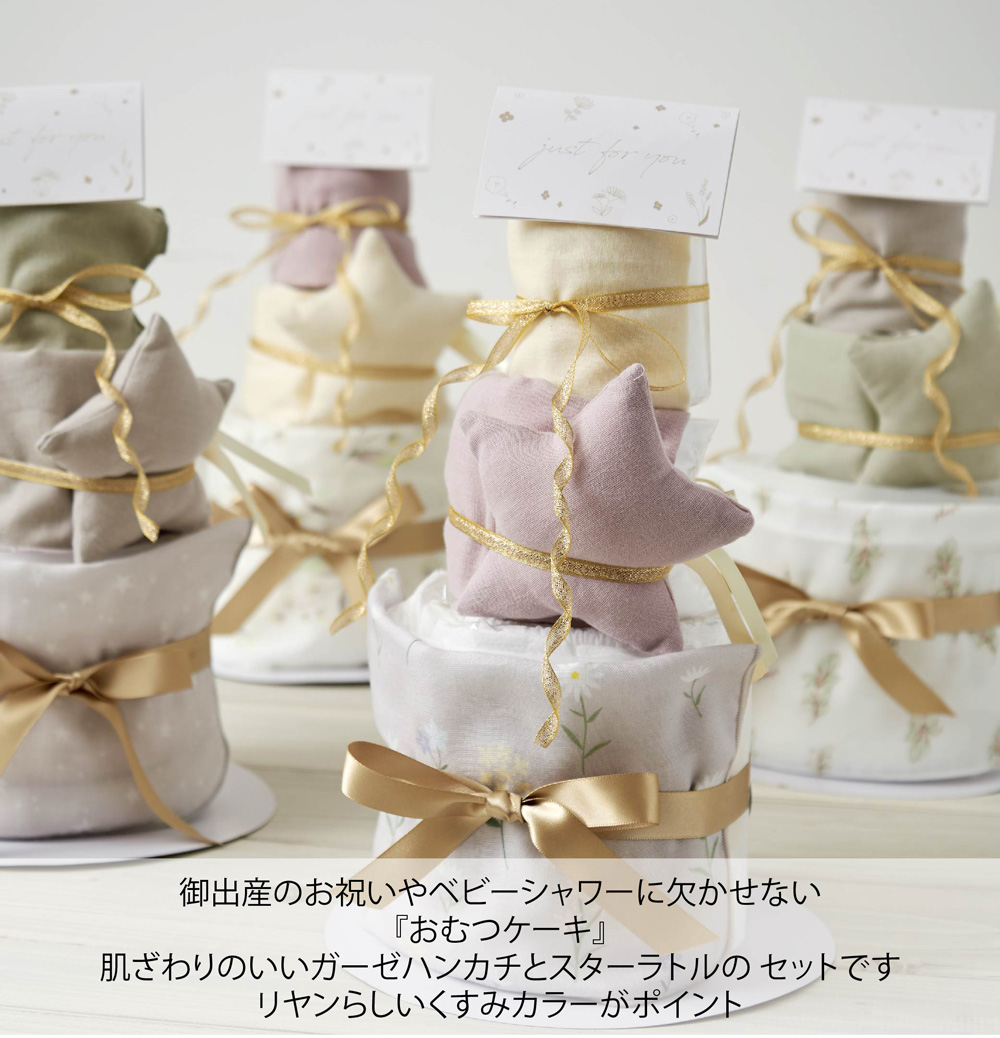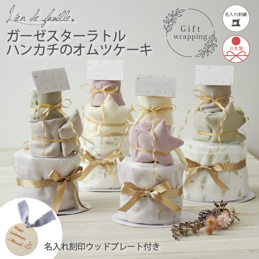 - Lien de familleオリジナルのガーゼハンカチとほしのラトルのおむつケーキ。